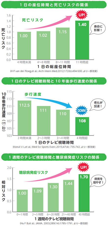 仕事はデスクワークが中心、移動手段は車、あるいは電車で空席があれば必ず座り、家に帰るとスマートフォンやテレビを座って眺め、読書や趣味の時間も座って過ごす……。一般的な日本人のライフスタイルとして、寝ている以外の大半は座って過ごすことが多いのではないでしょうか。しかし、この“座っている時間”が長過ぎると、様々な健康問題が発生するといわれています。