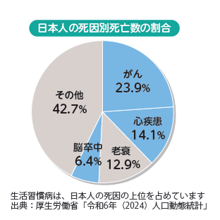 生活習慣病とは、不健康な生活習慣が重なることで、発症・進行しやすい※とされる病気の総称です。代表的なものに、がんや心臓病、脳卒中、糖尿病があります。これらの病気や合併症は、長期の治療や介護が必要となるものが多く、命に危険が及ぶことも。