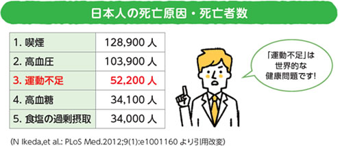 日本人の死亡原因に何が影響しているかを調べた研究*1によると、原因の1位は「喫煙」、2位は「高血圧」、3位が「身体活動不足(運動不足)」です。なんと運動不足が死亡の原因になるのです。なお、ここでいう「運動不足」はいわゆるスポーツだけでなく、仕事や家事、歩行移動など生活での運動も含まれます。この傾向は世界共通であり、WHO(世界保健機関)の調査でも同様の結果が出ています。