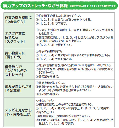 近年、筋肉がマイオカインという物質を分泌していることがわかってきました。マイオカインは全身の様々な臓器に影響を与え、病気や老化の抑制にも関連すると考えられています。筋肉を鍛えるとマイオカインの分泌量が増える、そして筋力が向上するとより楽に動ける身体になります。筋トレ(筋力トレーニング)と聞くと途端に無理!と思う人も、仕事や家事の合間にできるストレッチや何かをしながら行う“ながら体操”で、まずは筋力アップを目指してみましょう。