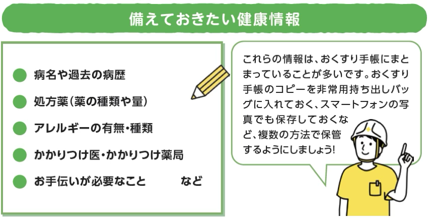 被災時には、あなたの病気や薬歴について把握していない医師に診察や薬の処方をしてもらうこともあります。そのようなときに頼りになるのが、あなたの健康に関する正確な“情報”です。おくすり手帳や薬剤の説明書など健康に関する記録を保管しておくようにしましょう。
