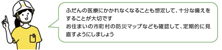 医薬品や生活必需品にどのような備蓄が必要かは、持病などによっても異なります。あなたにとって必要な備蓄について考え、かかりつけ医とも相談しておきましょう!