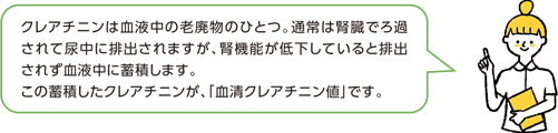 健康診断などの結果で「血清クレアチニン値」がわかる方は、下記の日本腎臓病協会のHPから「血清クレアチニン値」と「年齢」「性別」を入力してみてください。腎臓が老廃物を排泄する能力を示す数値である、GFR値が自動換算されます。あなたの腎臓の働きをチェックしてみましょう!