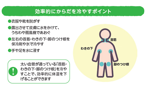 額や顔だけを冷やしても、からだの熱は下がりません。必ず太い血管やからだ全体を冷やすようにしましょう。