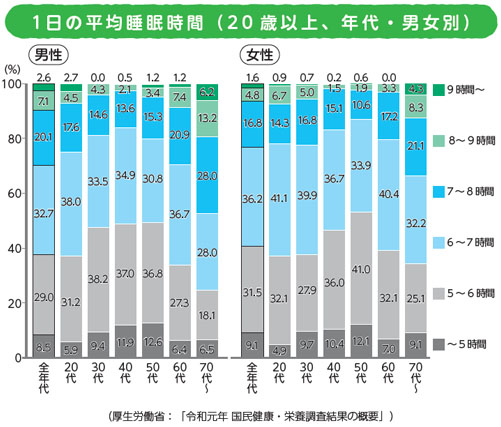しかし、厚生労働省の令和元年「国民健康・栄養調査」によると、睡眠時間が6時間未満の人は男性37.5%、女性40.6%と約4割にあたります。さらに年代別にみてみると、男性の30代47.6%、40代48.9%、50代49.4%、女性の40代46.4%、50代53.1%と、6時間未満の人は各年代のほぼ半数にものぼります。