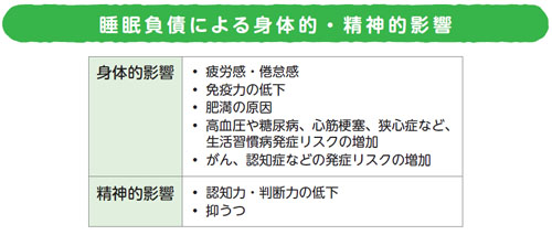 睡眠負債が蓄積すると、疲労回復が遅れる、血行や代謝の悪化から肥満につながる、意欲の低下、抑うつ状態になるなど、身体面・精神面のいずれにも悪影響を及ぼします。いま日常生活に支障がなくとも、いずれは糖尿病や心筋梗塞などの様々な生活習慣病の他、がんや認知症の発症への影響まで懸念される、深刻なリスクをはらんでいます。