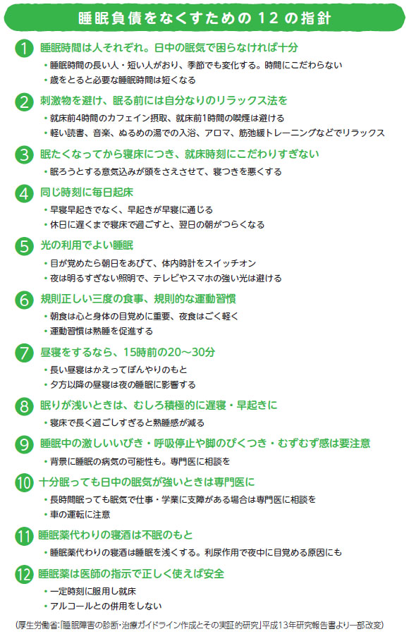 睡眠負債をなくせば、様々な生活習慣病になりにくくなるほか、疲れが残らなくなる、集中力や判断力が高まるなど、心身共に日常生活でのパフォーマンスの向上が期待されます。以下の「睡眠負債をなくすための12の指針」を参考に、よりよい睡眠のためにできることから取り入れてみましょう。